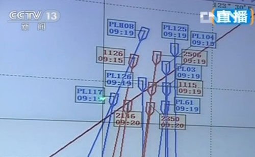 红色标识代表中国海警,蓝色标识代表日本海上保安厅的船(央视视频截图)